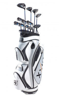 12 Tacos: Driver, Madeiras 3 e 5, Hybrid 4, Ferros 5 ao Pitch (Todos XXIO 8 Series) Sand Wedge Cleveland 588 RTX - 58° Putter Cleveland Smart Square Shafts: Graphite Regular CART Bag Branco Tudo Novo de fabrica e sem uso.